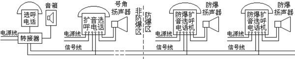 該防爆擴(kuò)音對(duì)講系統(tǒng)為無(wú)主機(jī)防爆擴(kuò)音對(duì)講電話系統(tǒng),不需要傳統(tǒng)的主機(jī),系統(tǒng)內(nèi)的防爆電話站由HZBQ—3A型防爆擴(kuò)音對(duì)講選呼電話機(jī)和dYH—5型防爆揚(yáng)聲器(防爆喇叭)等組成。兩個(gè)以上話站連接即可構(gòu)成生產(chǎn)調(diào)度系統(tǒng)。所有的防爆話站均并聯(lián)到兩根信號(hào)總線上。拿起防爆話站的手柄按被叫號(hào)碼,即啟動(dòng)被叫話站的功放電路,通過被叫話站的揚(yáng)聲器進(jìn)行廣播呼叫。可呼叫任意一部話站,或某一組話站,或全部話站,實(shí)現(xiàn)單呼、分組呼叫和全部呼叫功能,實(shí)現(xiàn)分級(jí)調(diào)度。該擴(kuò)音對(duì)講系統(tǒng)采用兩芯信號(hào)總線傳輸,由交流電源供電。該擴(kuò)音對(duì)講系統(tǒng)具有使用簡(jiǎn)單,安裝和維修方便,通話效果好,擴(kuò)音功率大,性能價(jià)格比高,應(yīng)用范圍廣等優(yōu)點(diǎn)。適用于空間大,環(huán)境嘈雜,崗位分散的場(chǎng)所,用于生產(chǎn)調(diào)度和聯(lián)絡(luò)通訊。